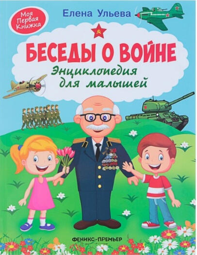 Ульева, Е. Беседы о войне : энциклопедия для малышей / Е. Ульева. – Ростов – на – Дону : Феникс, 2019. – 135 с.: ил. – (Моя первая книжка).А что ваш ребенок знает о Великой Отечественной войне? Нельзя воспитать настоящего человека, забывая историю, историю своей страны. Эта энциклопедия расскажет ребенку обо всём, что происходило в тяжёлое военное время, какое оружие использовалось во время войны, о маленьких и больших героях, о мужестве, подвиге и бессмертной славе. Мы должны знать свою историю. Нам есть чем гордиться!